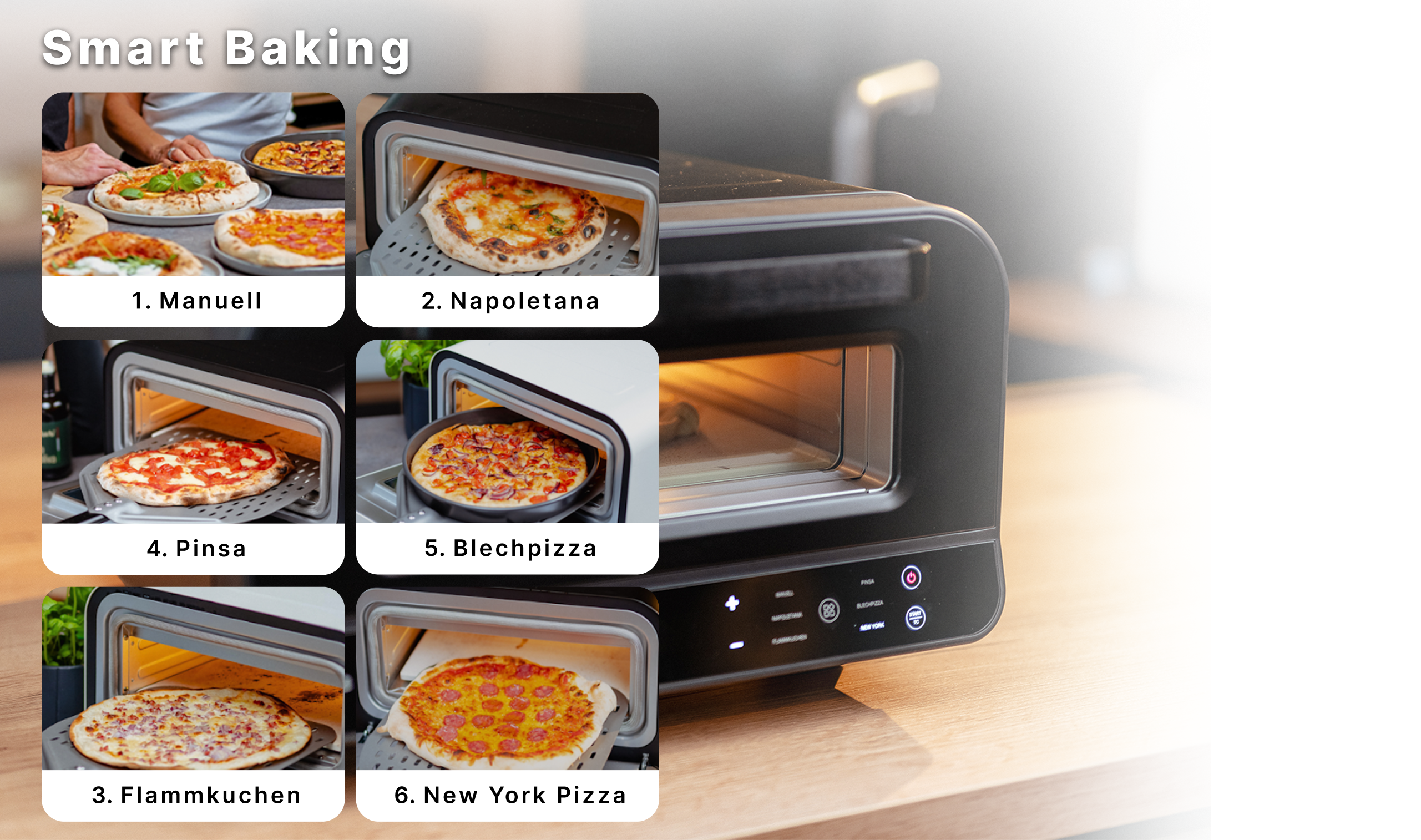 6 Smart-Baking-Programme – perfekt abgestimmt für jeden Pizzastil (Napoletana, Pinsa,Blechpizza, Flammkuchen, New York und Manuell) – kein Drehen oder Kontrollieren nötig
